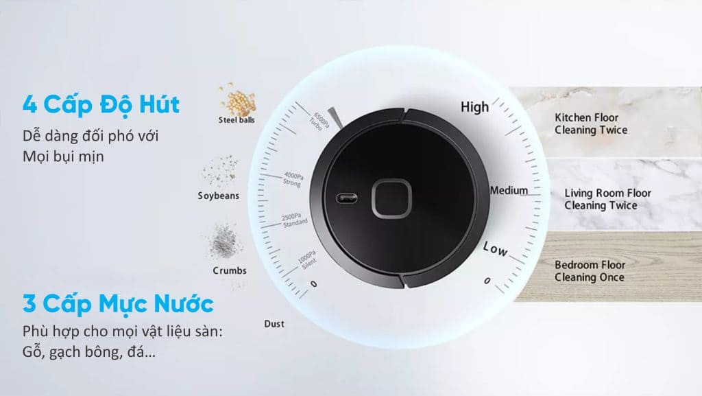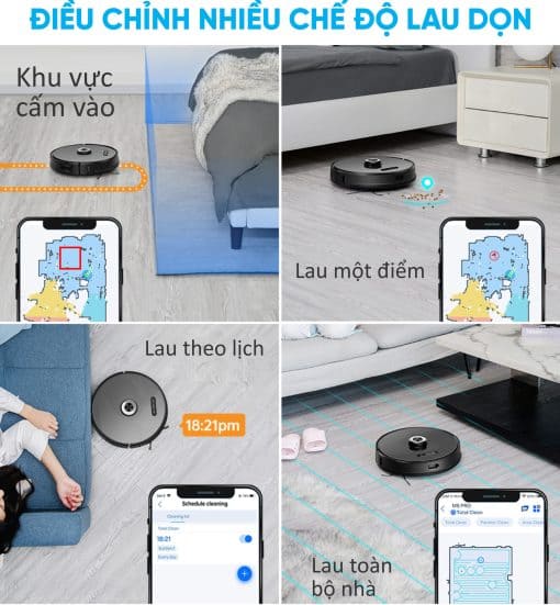 Tính Năng: Hoạt động với 6 chế độ: Tự động, Hẹn giờ, Hút Lau theo điểm, Hút lau theo khu vực, Hút