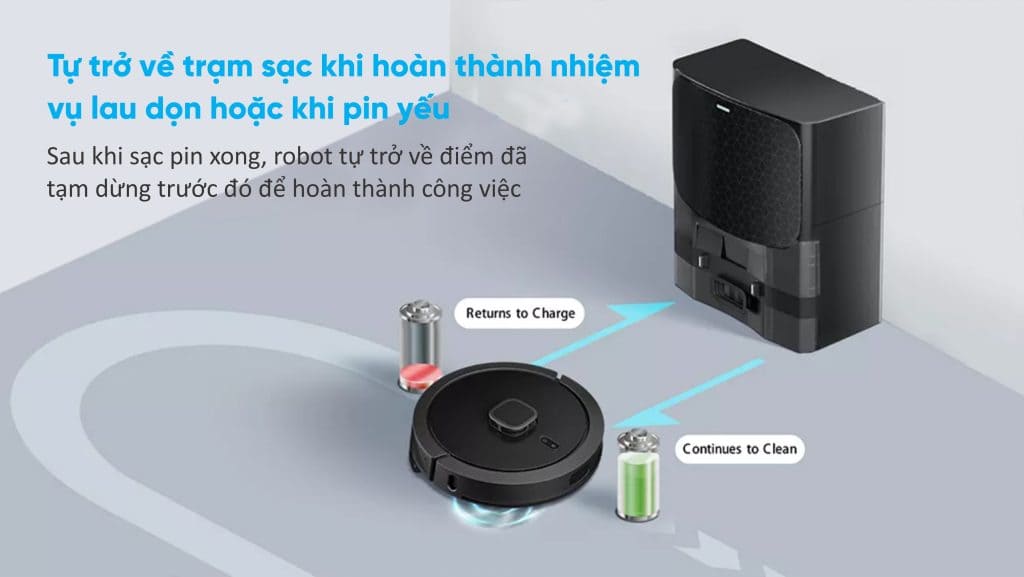 Tính năng Breakpoint Continuous (Điểm ngắt liên tục), robot dừng làm việc ở đâu, robot sẽ ghi nhớ, sau khi sạc xong sẽ chạy tới đó làm tiếp